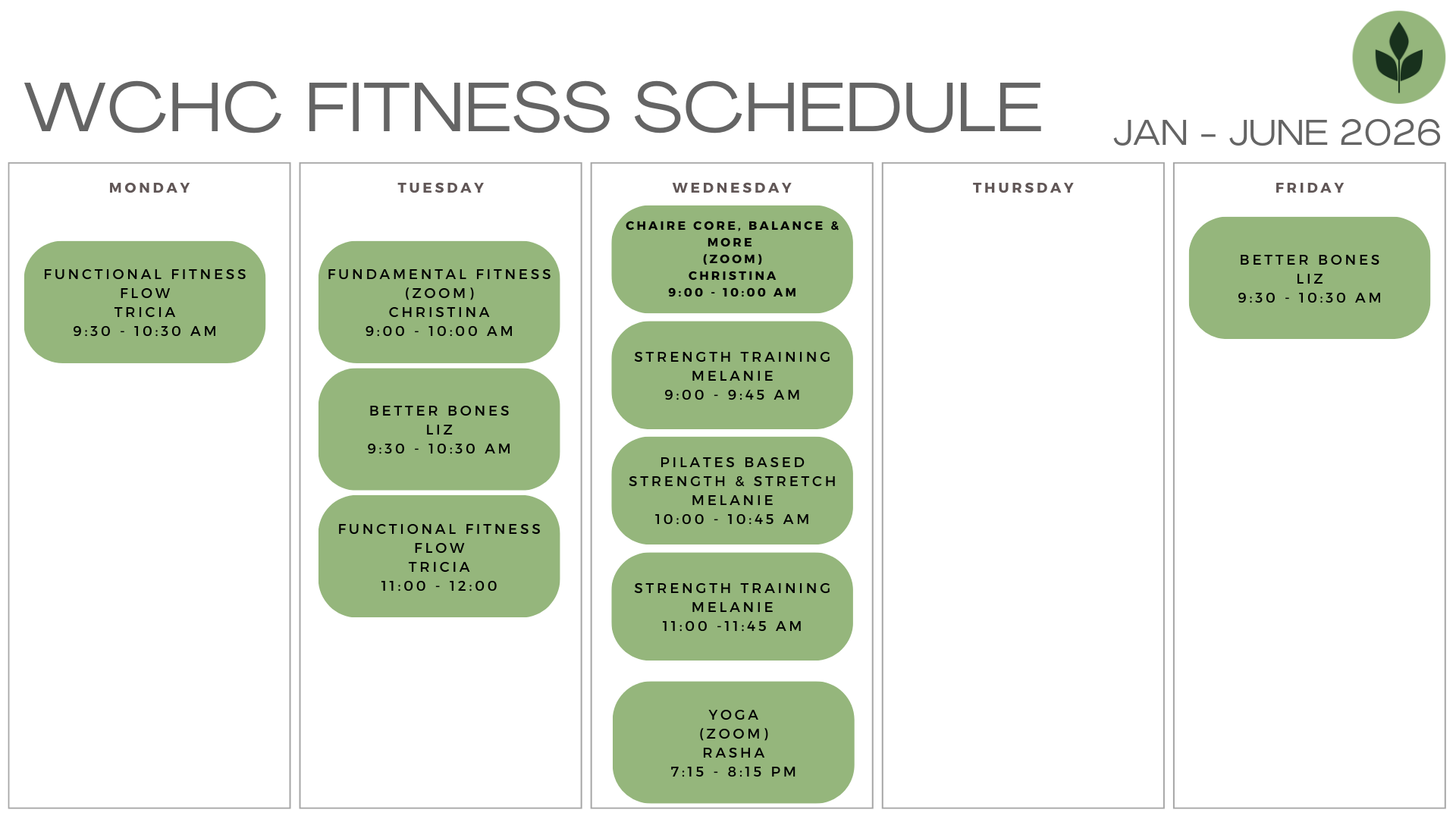 Fitness classes are available in-person and virtual (on Zoom). Each class will be labelled either as in-person or virtual. In-person classes will take place at 10 Parkside Dr. in St. Jacobs.